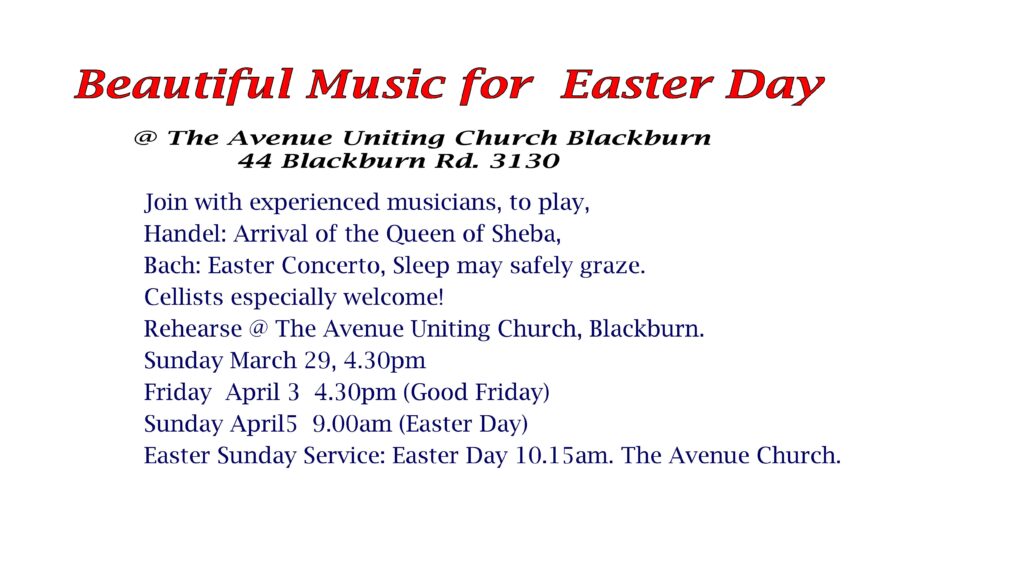 Rehearse : Sundays May 24, May 31, 4.30pm @ TheAvenue Uniting Church, Blackburn